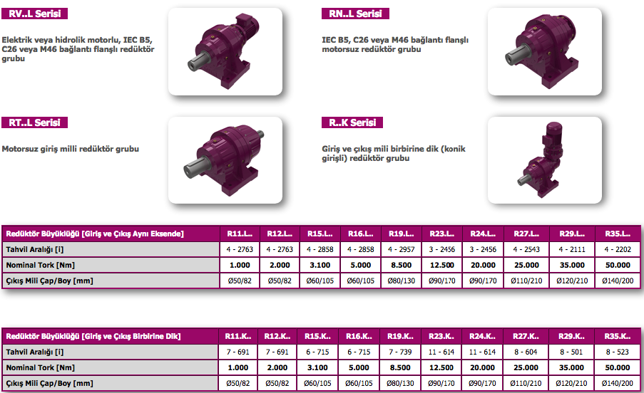 Planet Redüktörler günümüzde birçok uygulama alanında ihtiyaç haline gelen ufak hacimde yüksek tork isteklerini karşılamak amacı ile üretilmiş, modüler yapıda, uydu, güneş ve iç dişlilerden oluşan redüktör tipleridir. R serisi redüktörler ayak bağlantılı redüktörlerdir. Farklı sektörlerden gelen talepleri karşılaması amacı ile geniş bir ürün çeşitliliği ve opsiyonel aksesuarları ile piyasaya sunulmuştur. Ufak hacimlerde yüksek tork taşıma kabiliyetleri nedeni ile güç yoğunluğu yüksek redüktörlerdir ve bu nedenle kullanıldıkları uygulamaya bağlı olarak ısıl güçlerinin kontrol edilmesi gerekmektedir. Özellikle mobil uygulamalarda yoğun olarak kullanılan planet redüktörler, vinç, metal şekil verme, inşaat alanlarında da kullanıldığı gibi yenilenebilir enerji sistemlerinden biri olan rüzgar türbinlerinde, kanat hatve ve kule çevirmede yaygın olarak kullanılmaktadır.