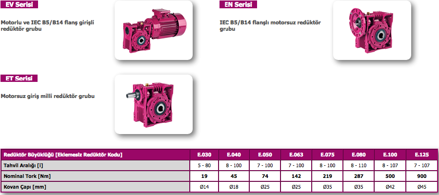 E Serisi redüktörler, sonsuz vida ve dişli kademesinden oluşan redüktörlerdir. Giriş ve çıkış millerinin 90º olması gereken uygulamalarda kullanılır. Sertleştirilmiş ve taşlanmış vida malzemesi (21NiCrMo2)ve fosforlu bronzdan imal edilen çark (Gz12SnCuNi) yüksek mukavemet ve verim sağlamaktadır. E serisi redüktörler her yandan bağlanabilen değişebilir gövde sistemi ile montaj kolaylığı ve esnekliği getirmektedir. Flanş ve çıkış mil bağlantıları çok alternatifli montajlar için uygundur. E30’dan E80’e kadar olan gövdelerde alüminyum enjeksiyon döküm, E100 ve E125 gövdede ise pik döküm gövde malzemesi kullanılmıştır.